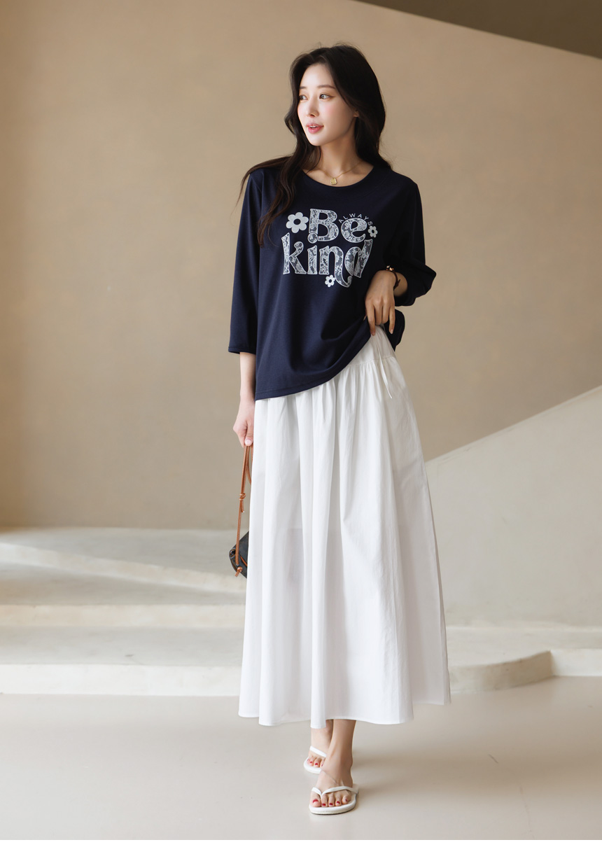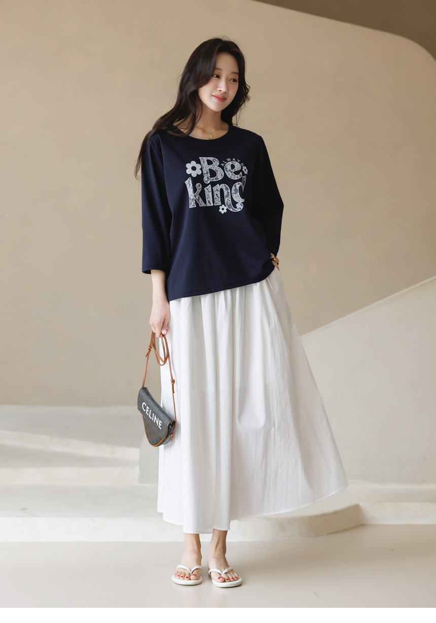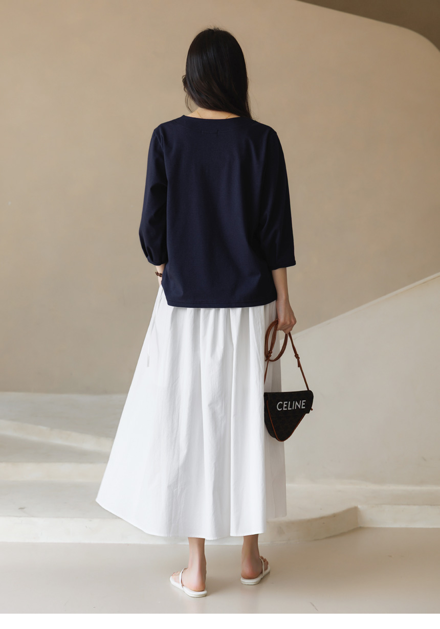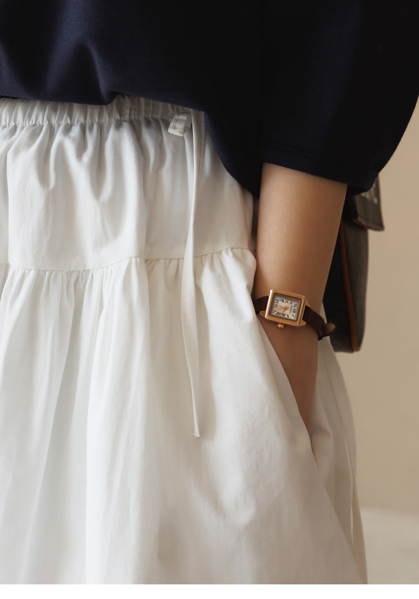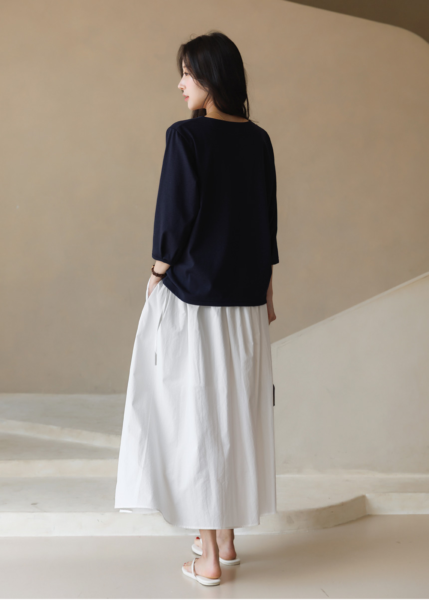 [Theonme] 플레온 허리 스트링 리본 셔링 A라인 플레어 면 롱 스커트