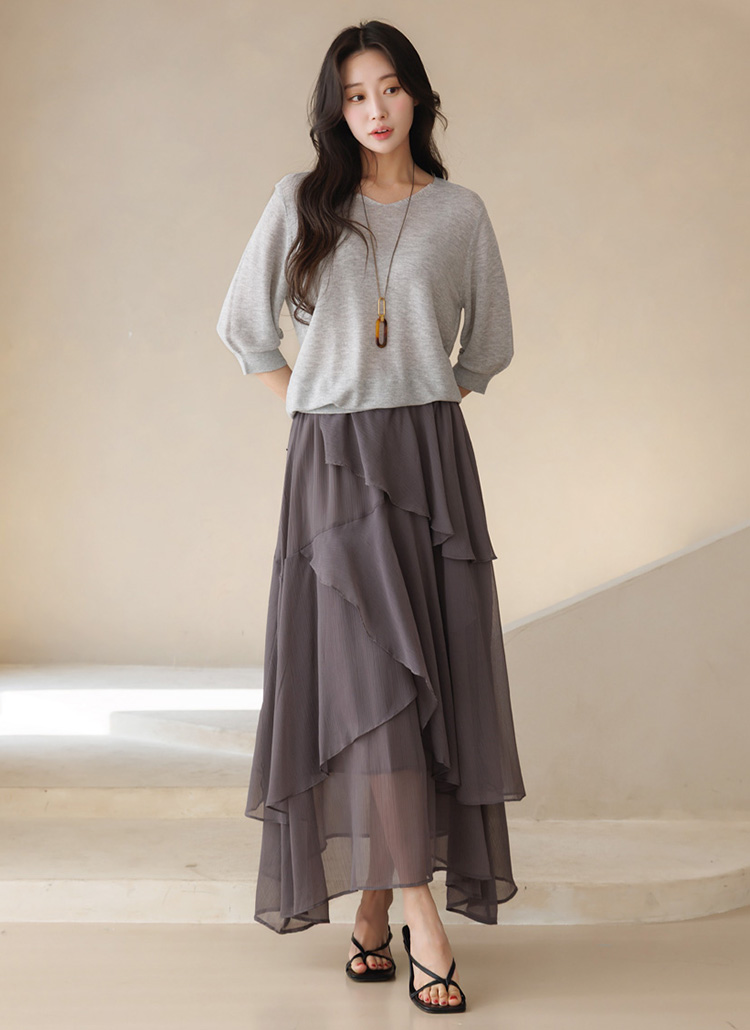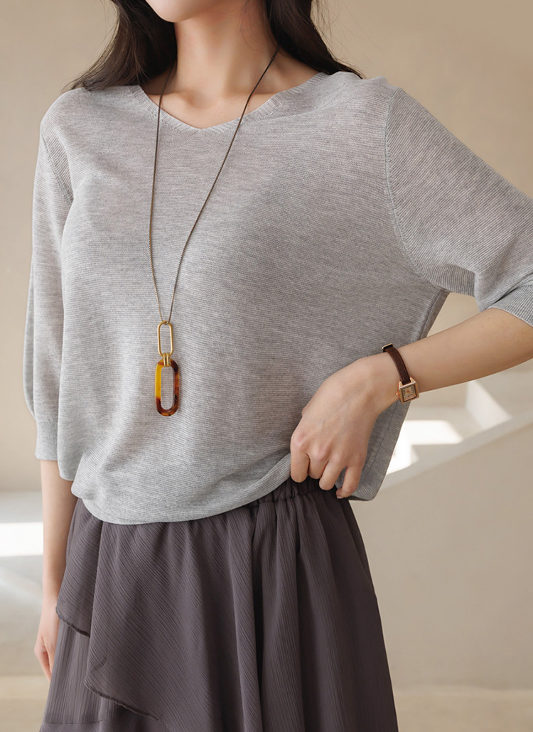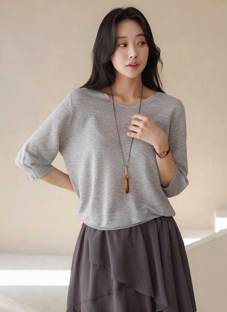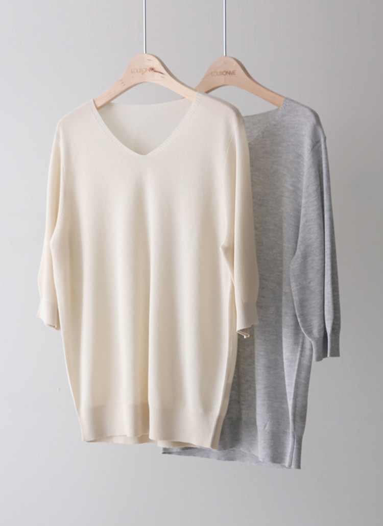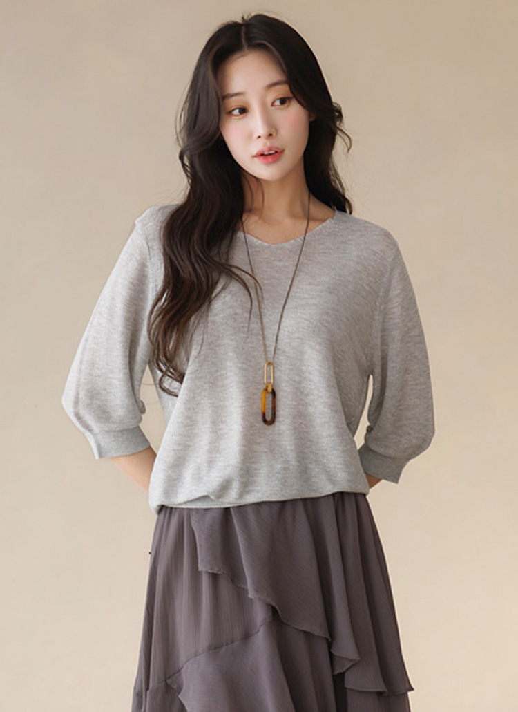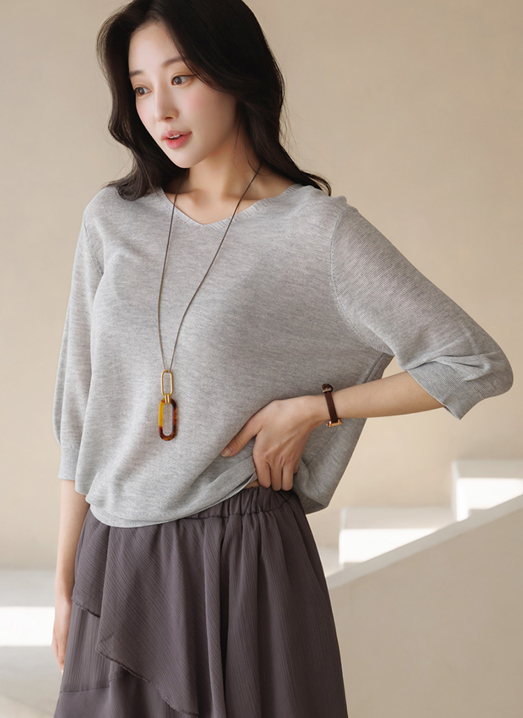 [Theonme] 레이첼 여리 시스루 심플 베이직 브이넥 7부소매 니트