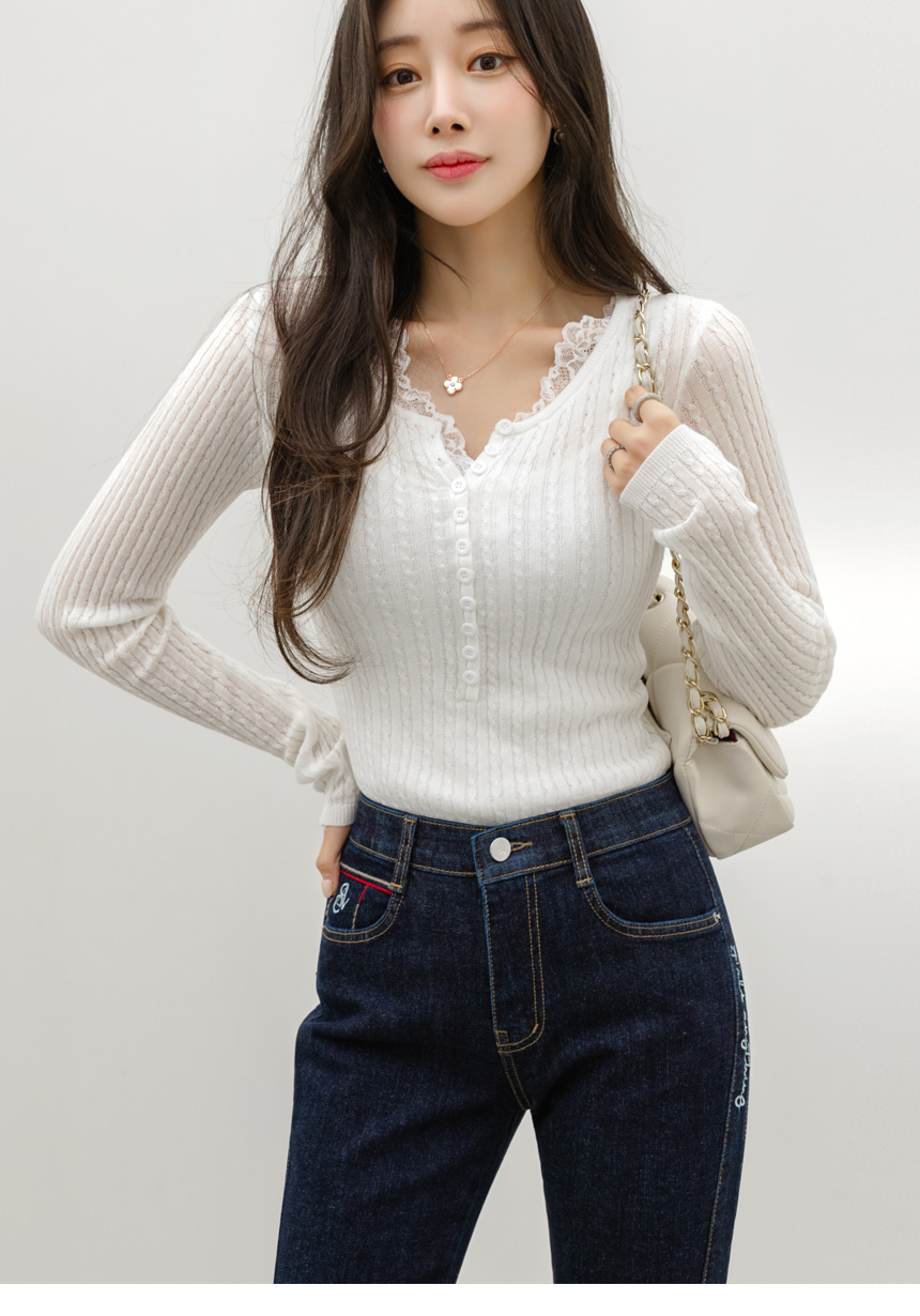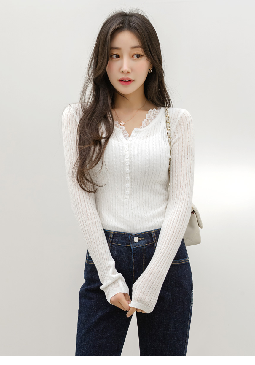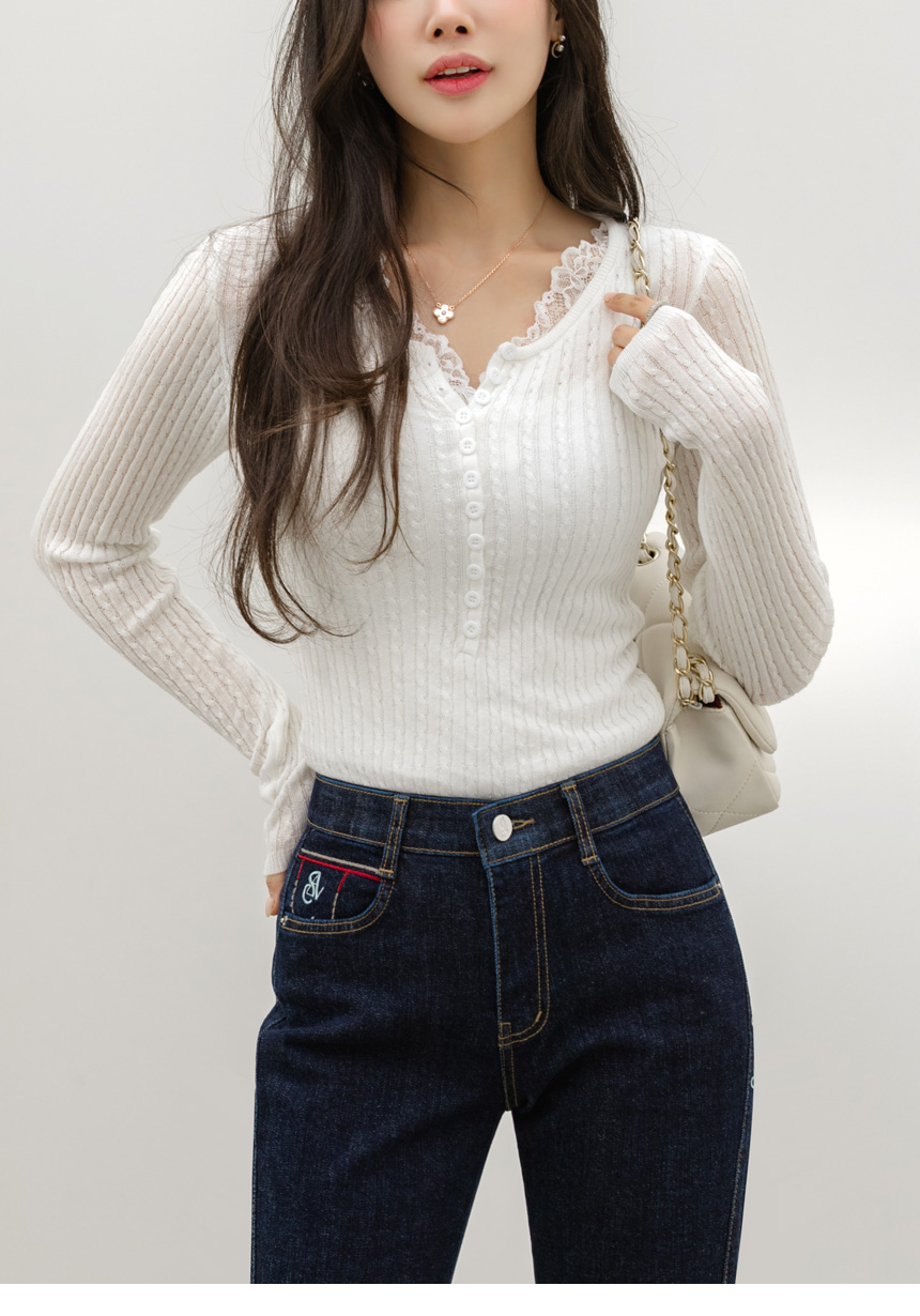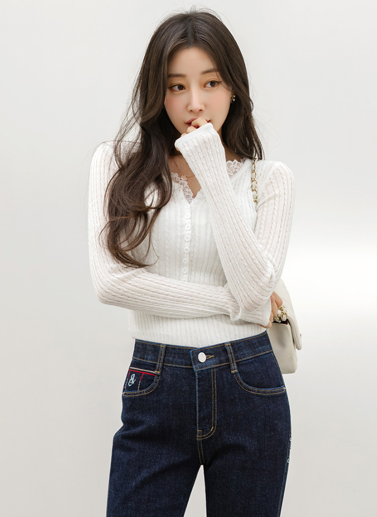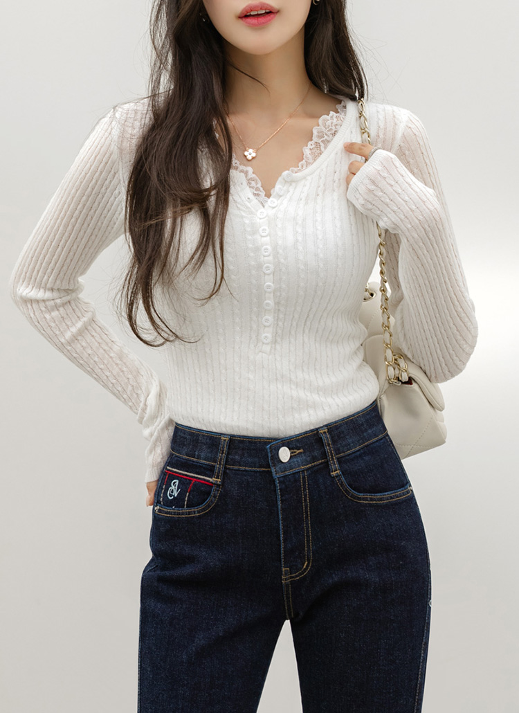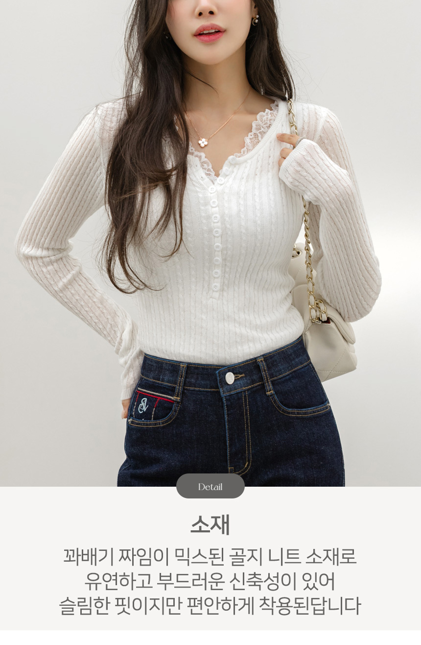 에멘탈 플라워 레이스 배색 슬림 실루엣 스카시 꽈배기 골지 니트