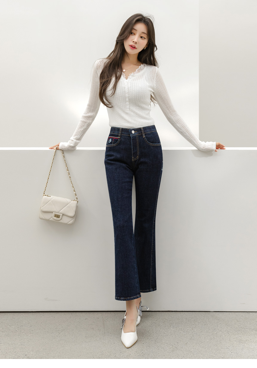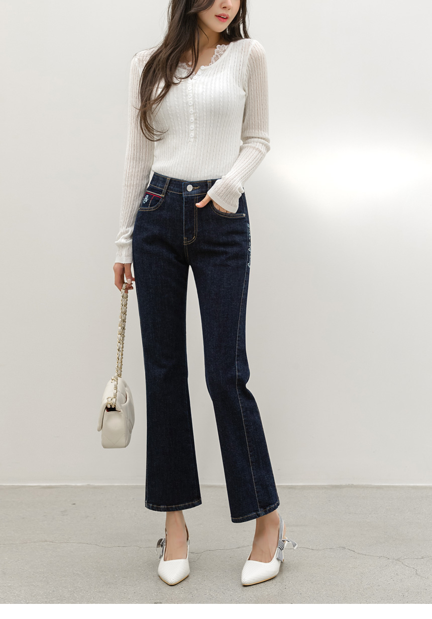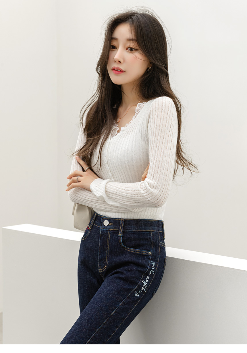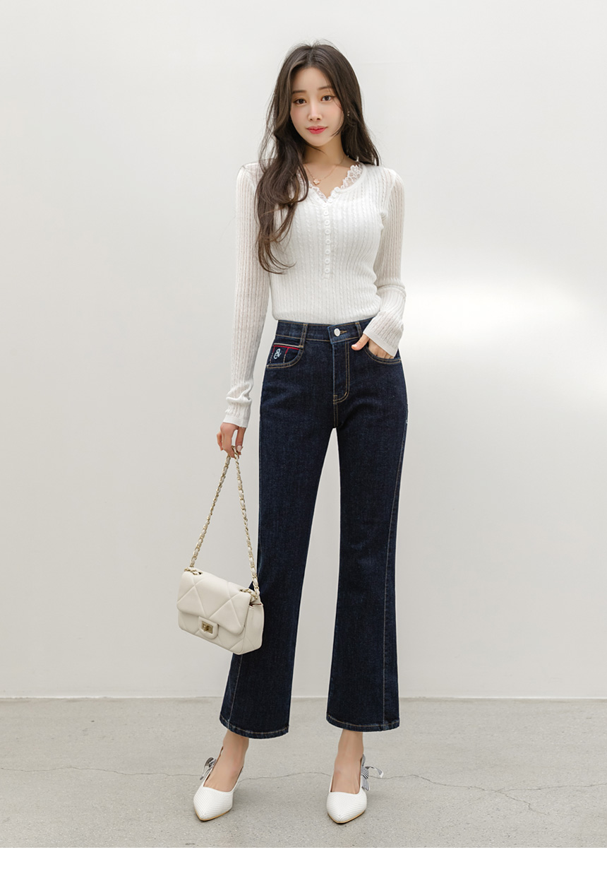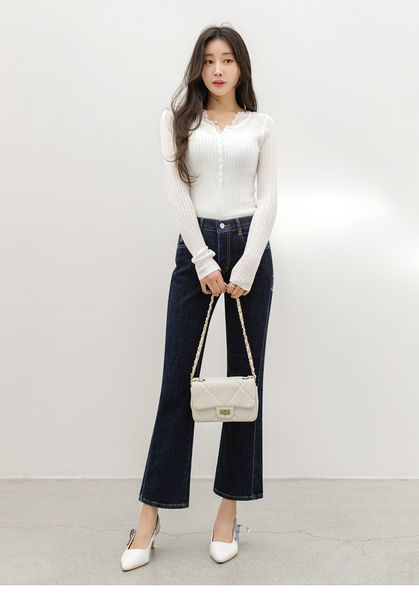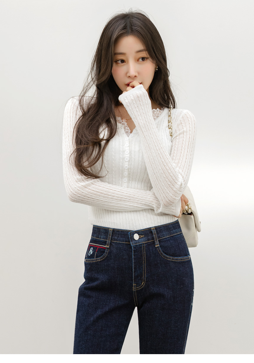 에멘탈 플라워 레이스 배색 슬림 실루엣 스카시 꽈배기 골지 니트