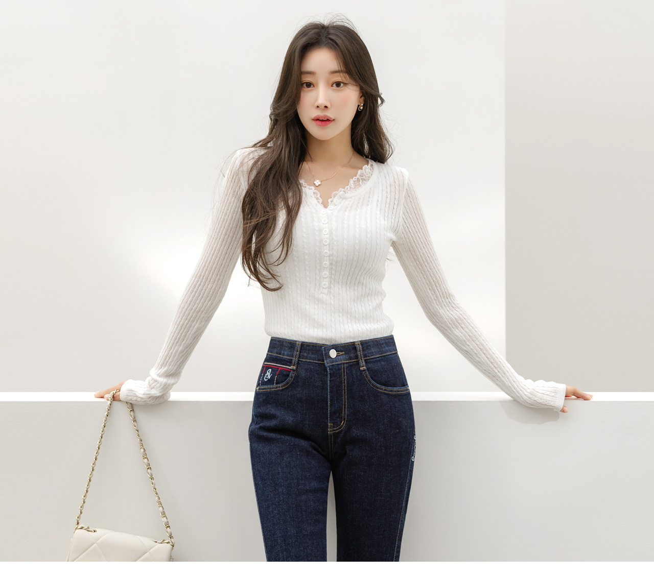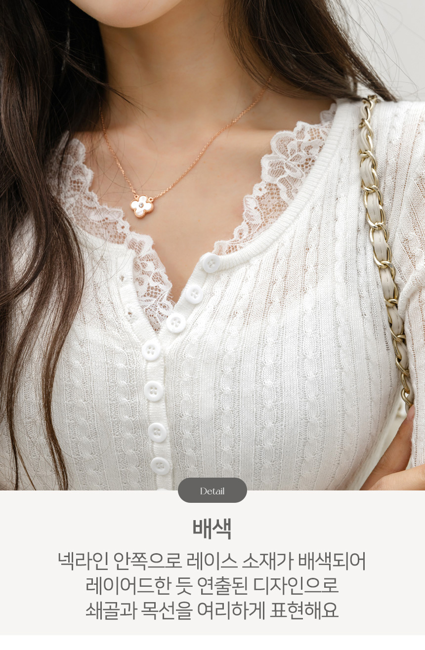 넥 라인을 따라 더해진 플라워 레이스 배색이