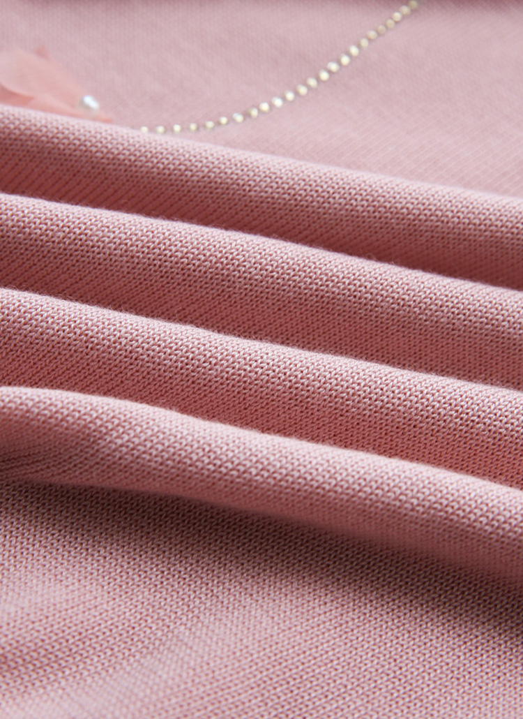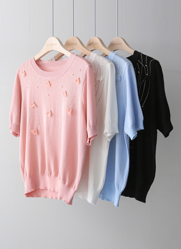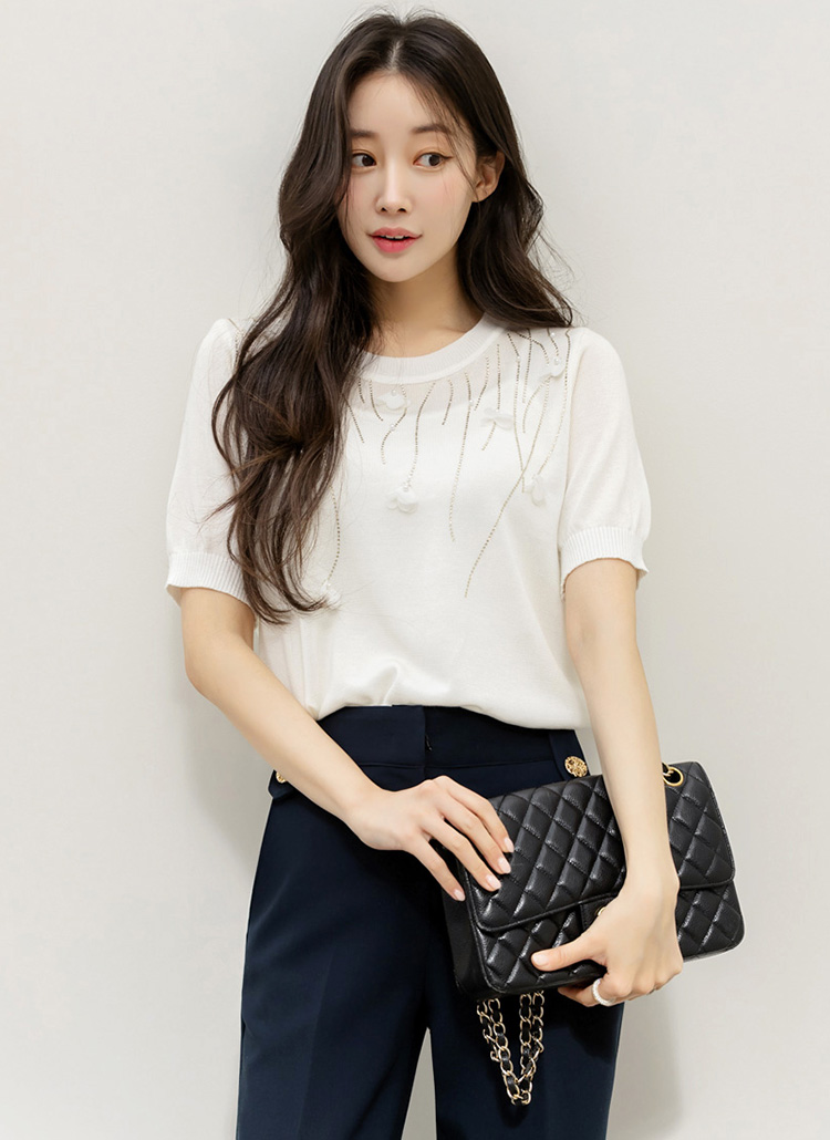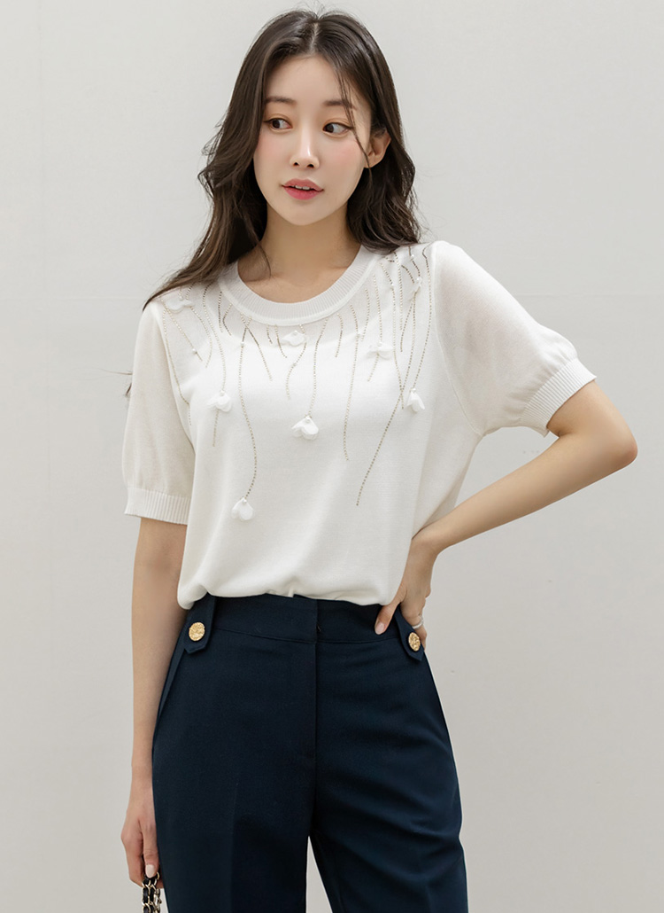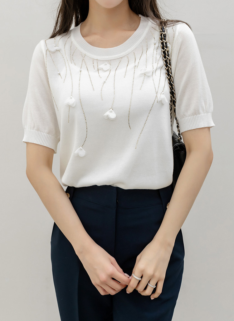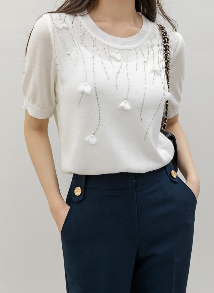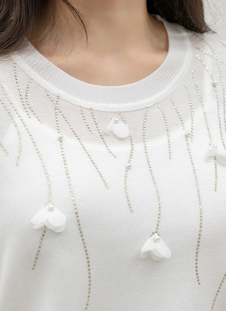 드로핑 진주 쉬폰 꽃잎 핫픽스 베인 라운드 반팔 니트