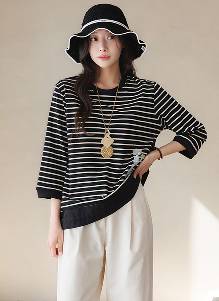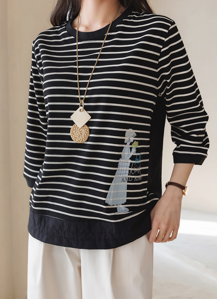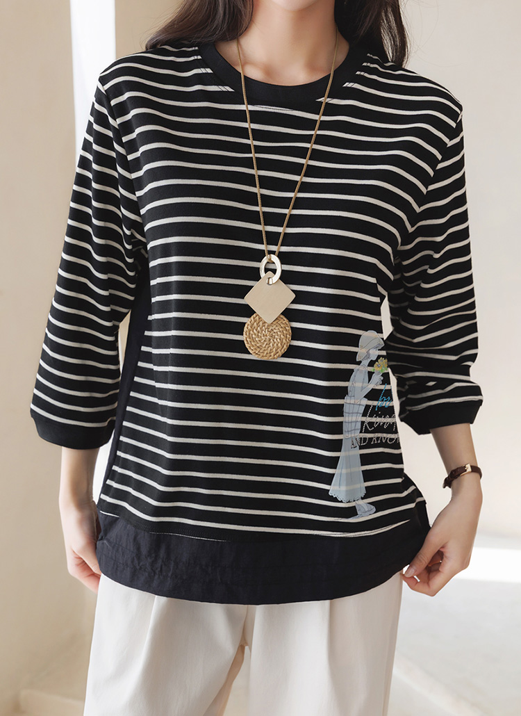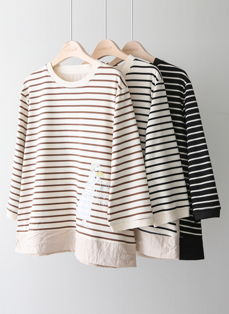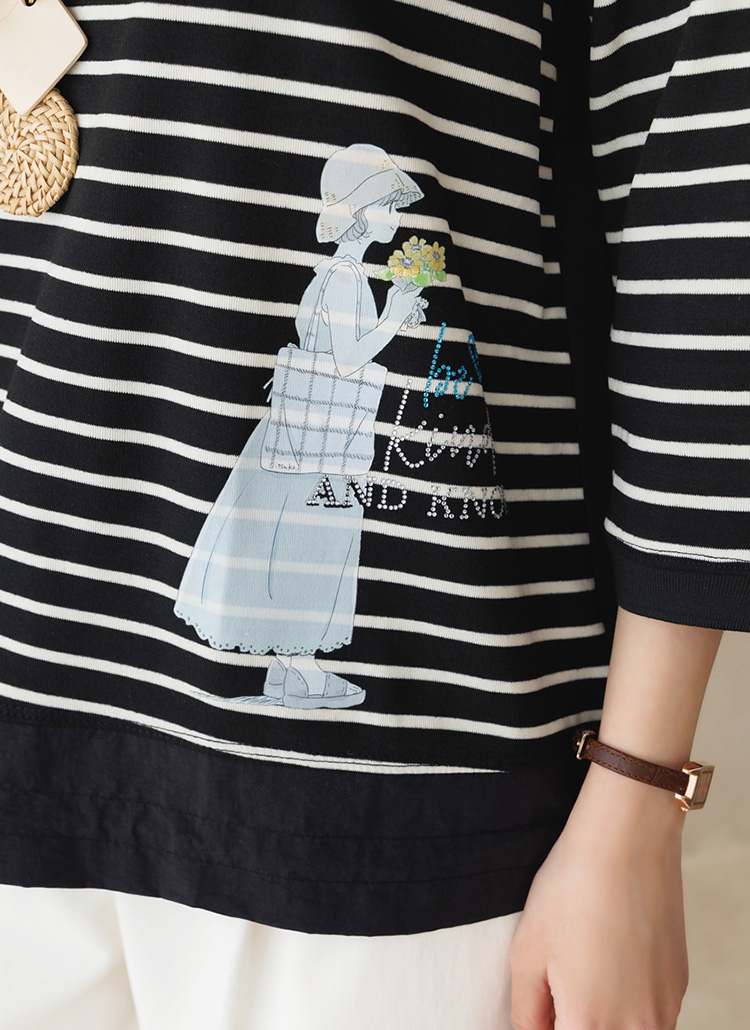 [Theonme] 헤이플 밑단 스트링 스프링걸 프린팅 스트라이프 배색 티셔츠