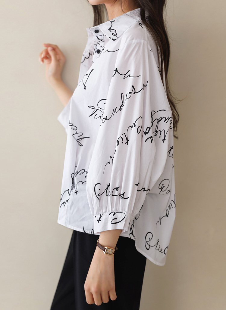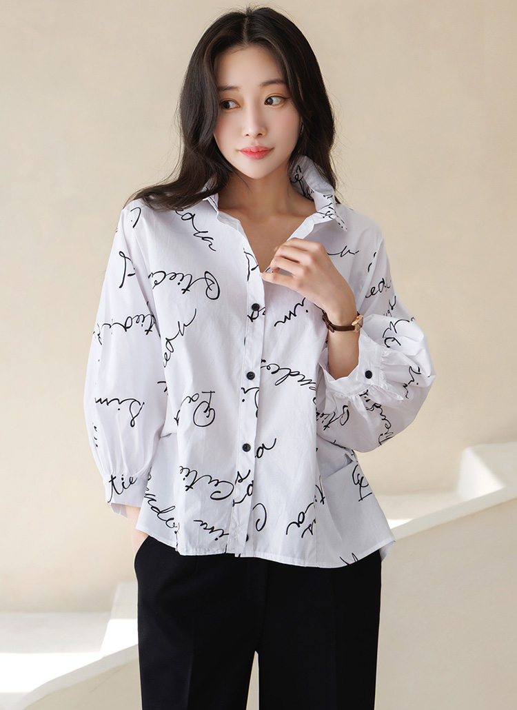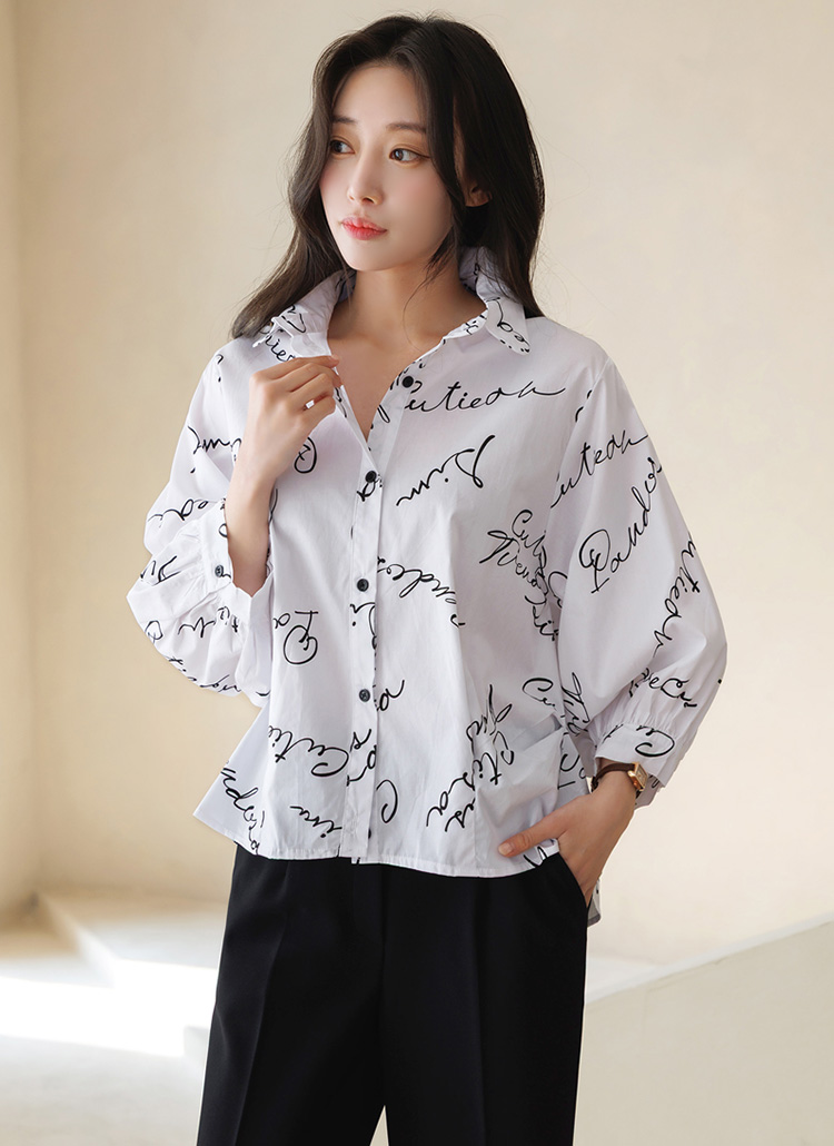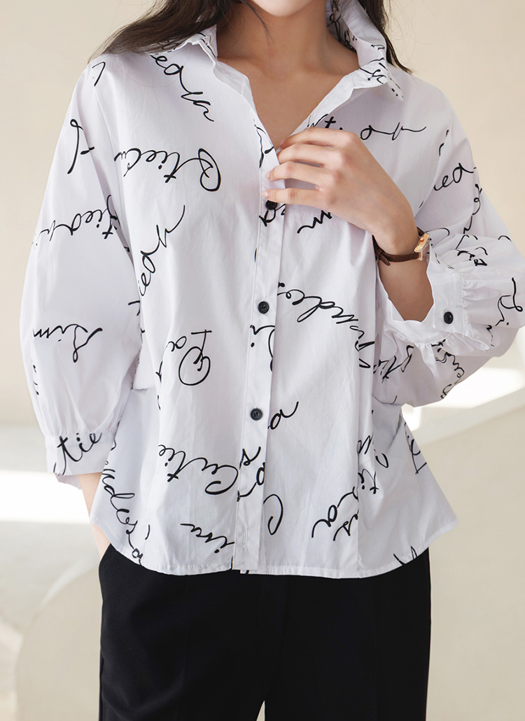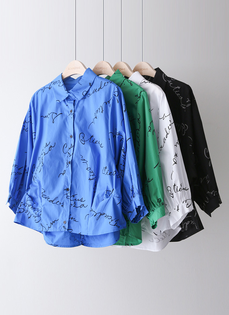 [Theonme] 루디아 7부 셔링 벌룬 소매 루즈 카라 레터링 셔츠 남방