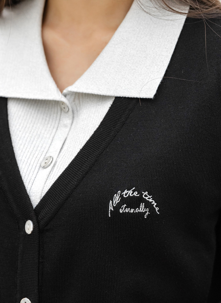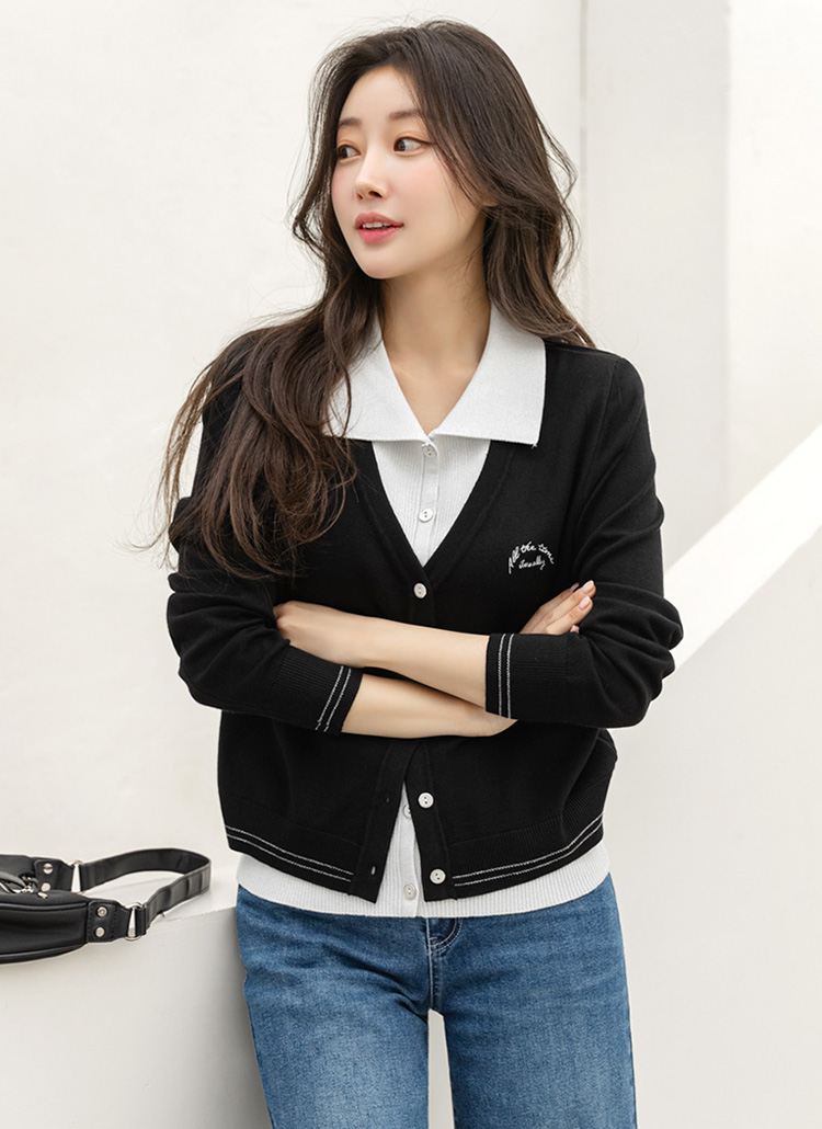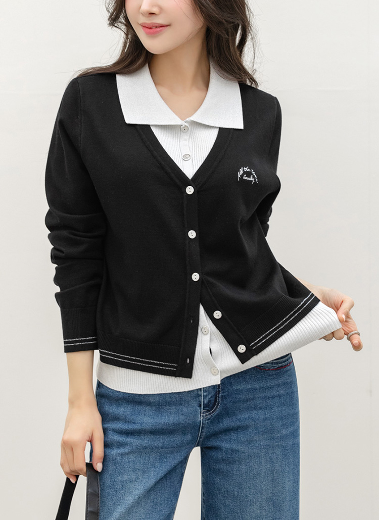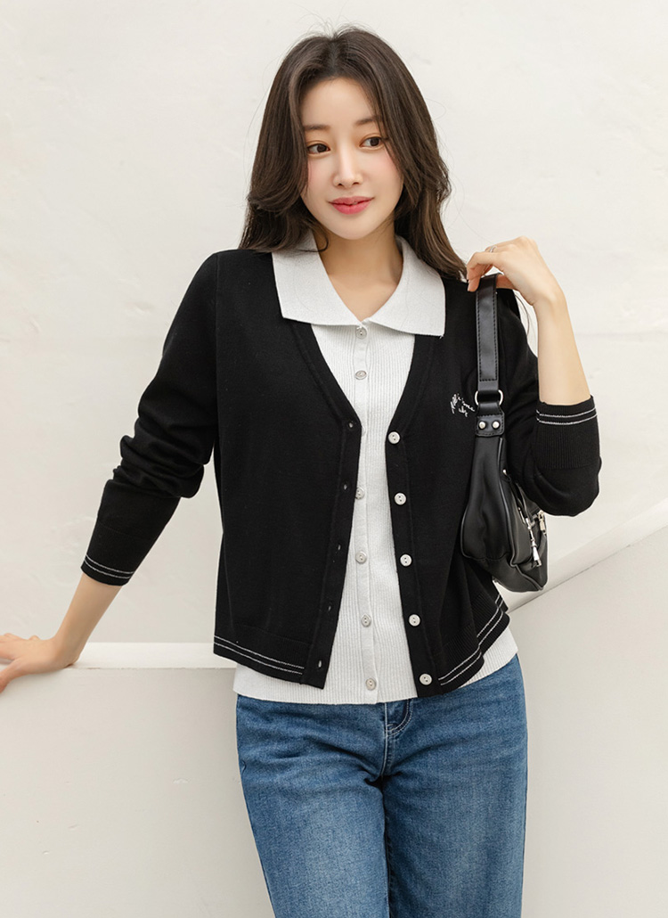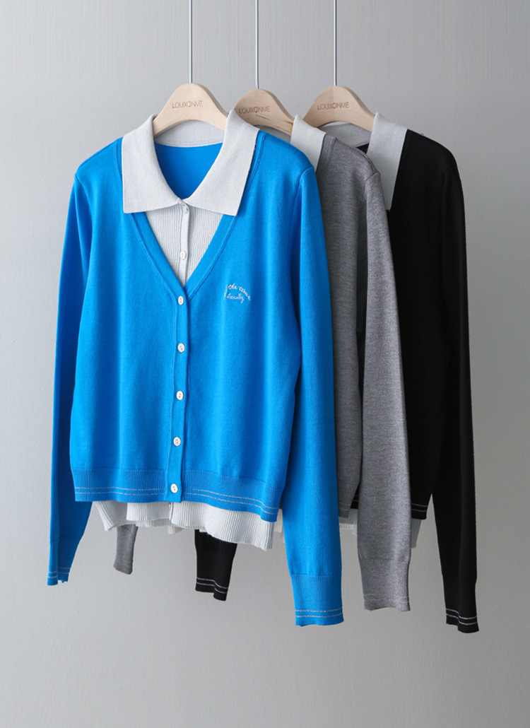 카라 니트와 브이넥 가디건을 레이어드한 듯한 이중 디자인으로