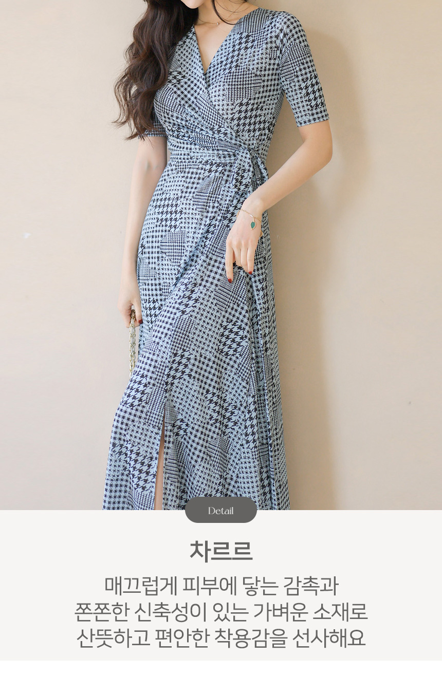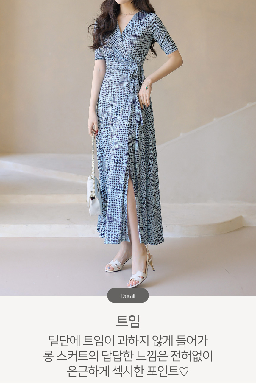 랩 디자인으로 우아하게 감싸지는 실루엣이 돋보이는 A라인 롱 원피스예요