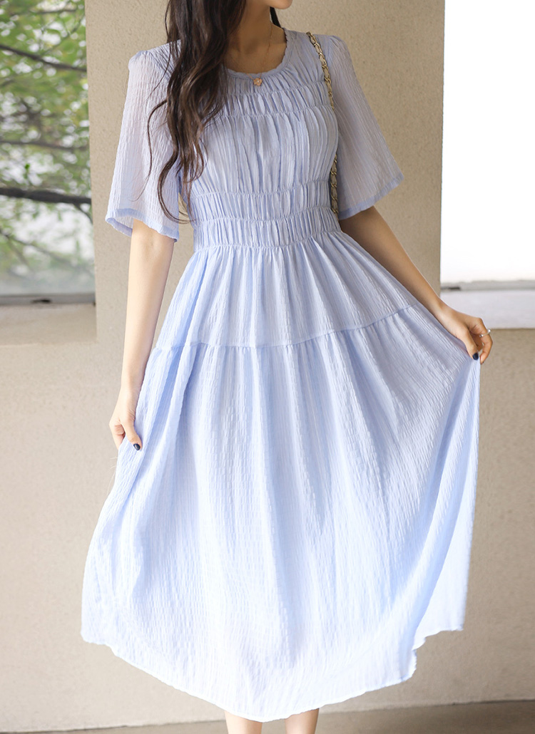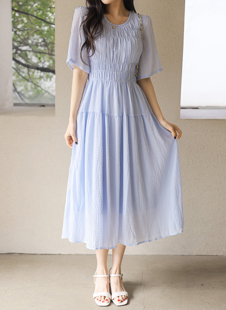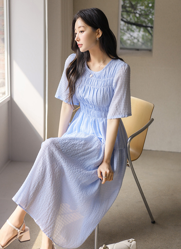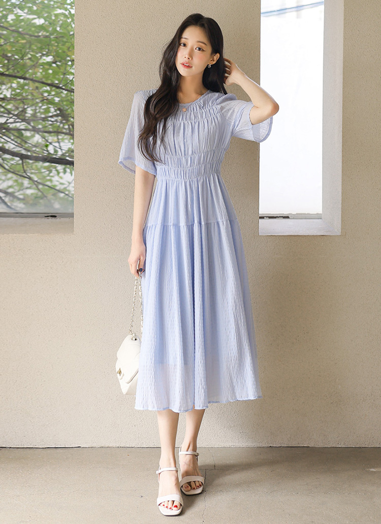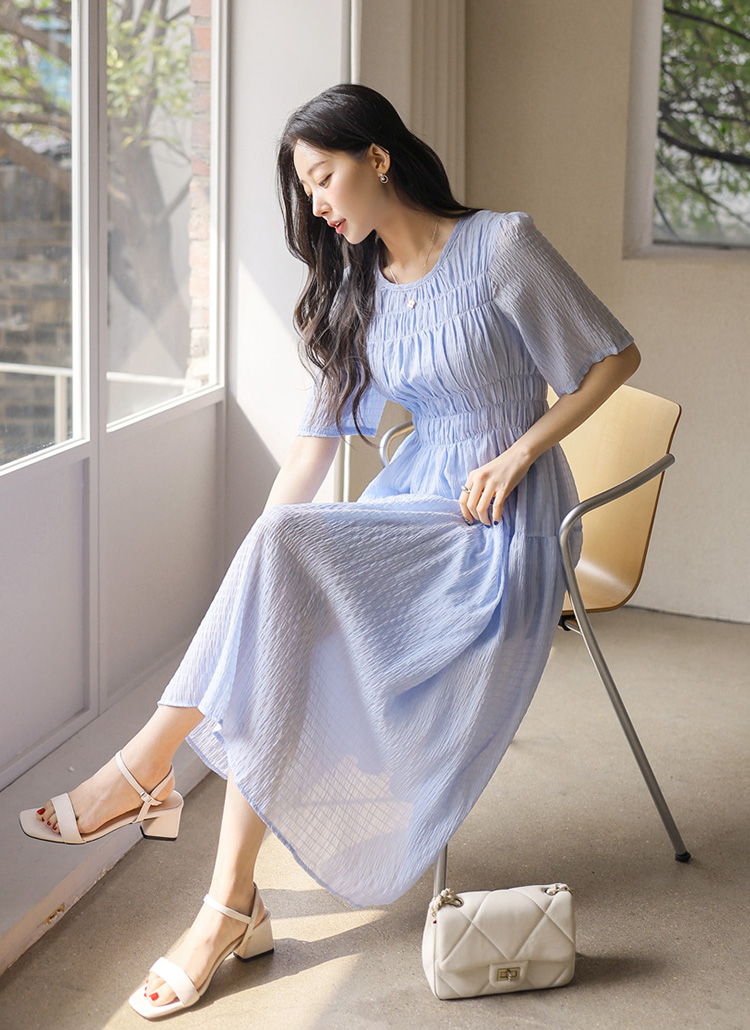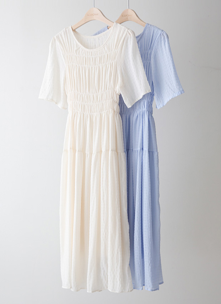 시어서커 지지미 스모킹 셔링 A라인 5부소매 롱 원피스