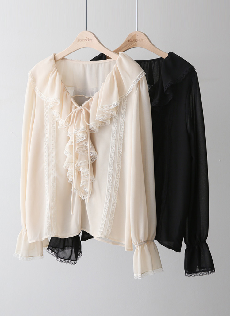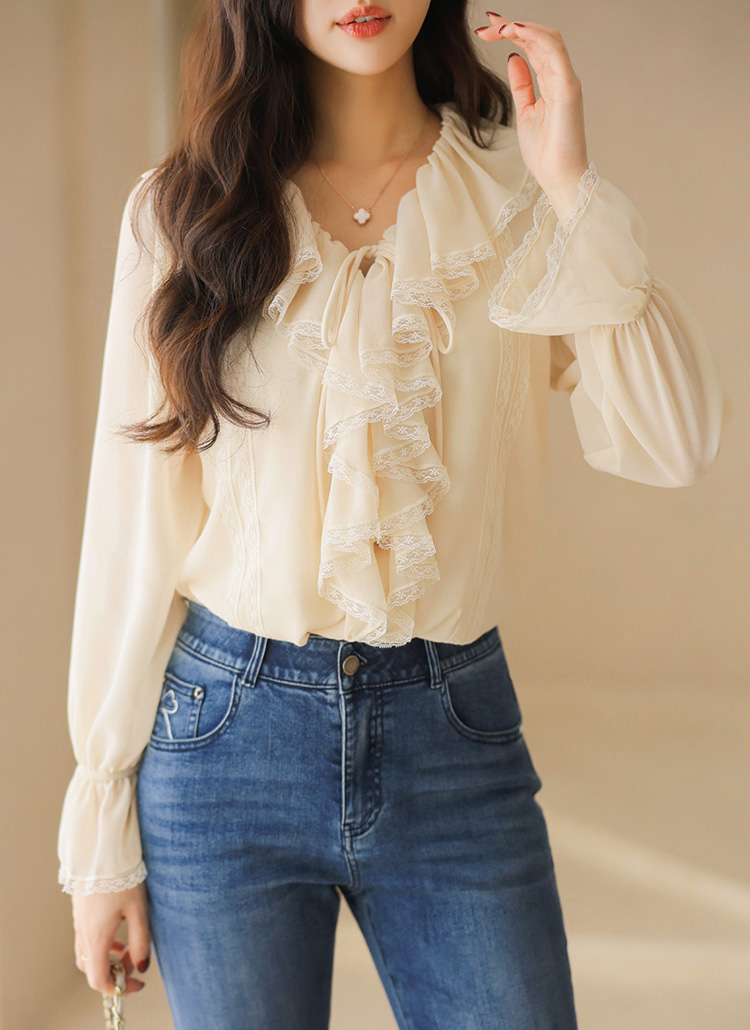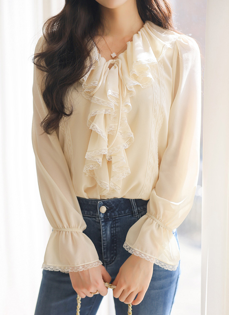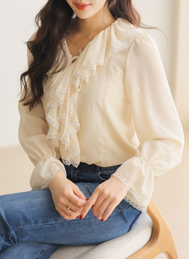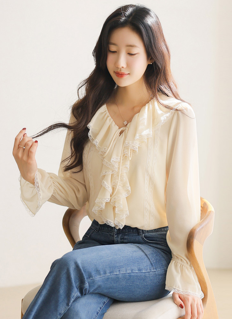 사랑스러운 디테일과 우아한 실루엣이 어우러진 러플넥 레이스 블라우스예요