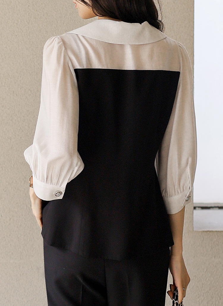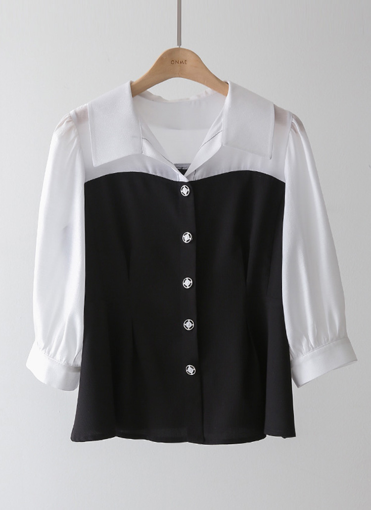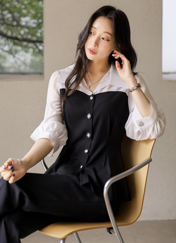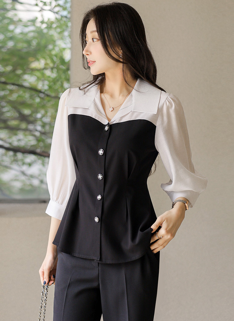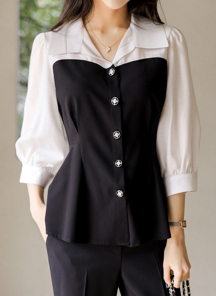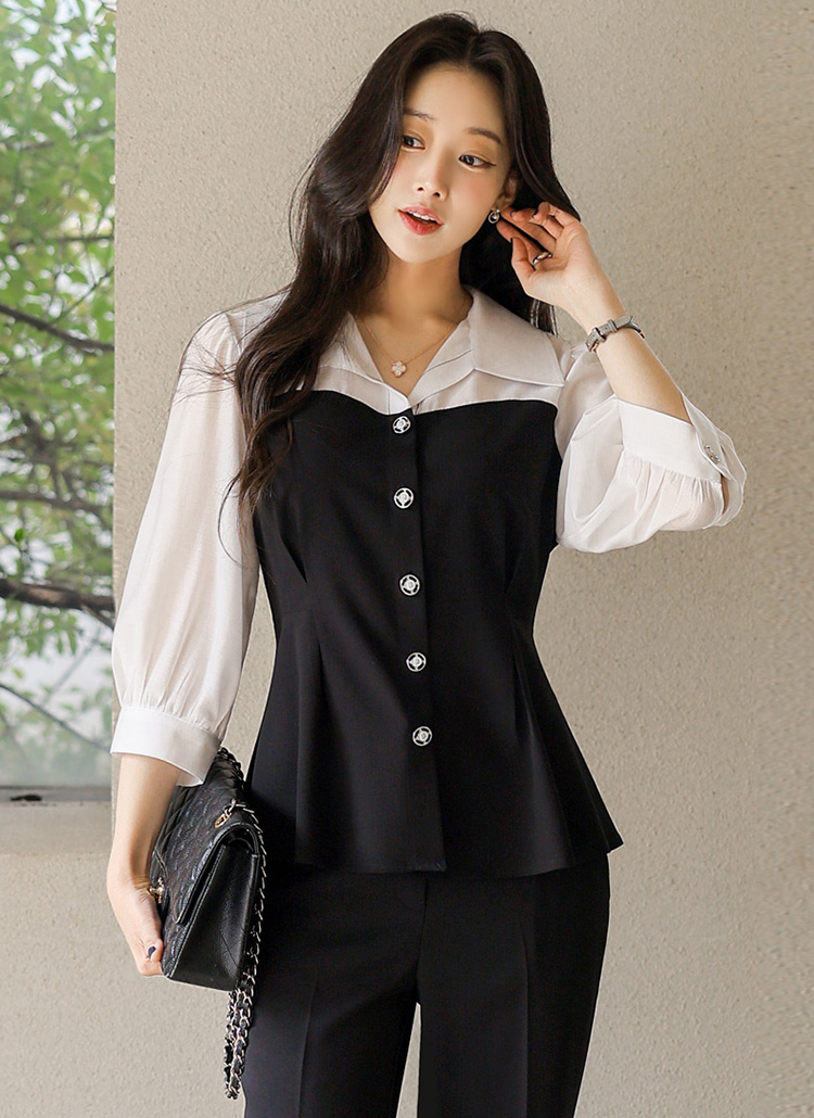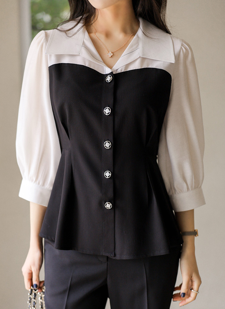 [LouisAngel] ハートライン配色 オープンカラー ペプラムブラウス bl45215