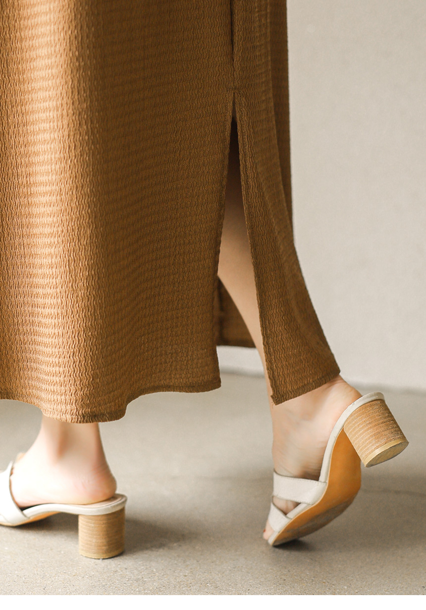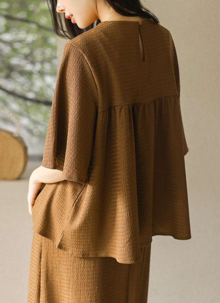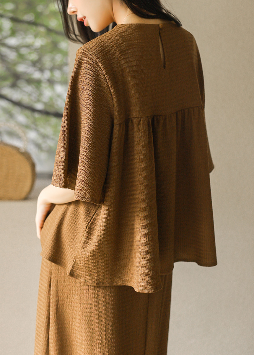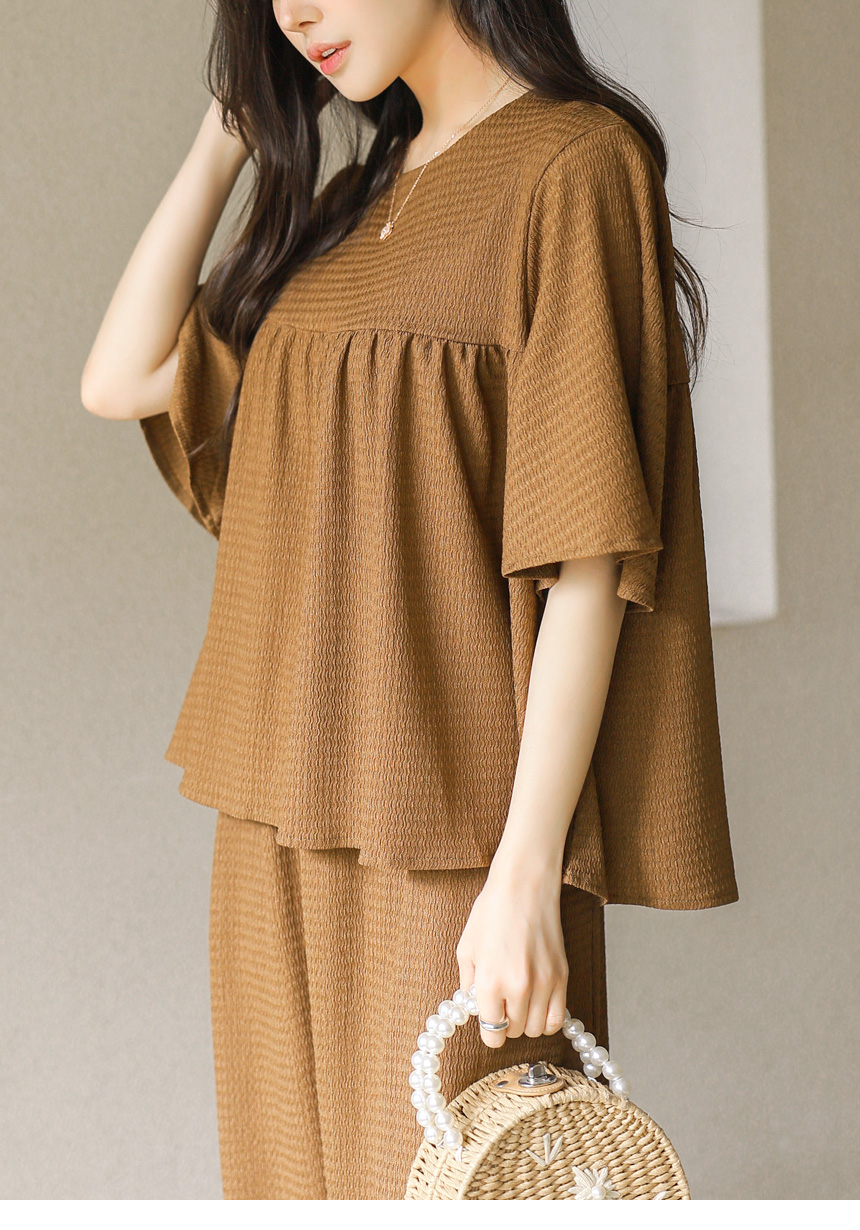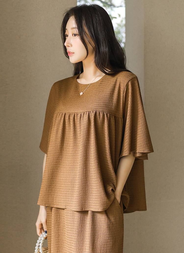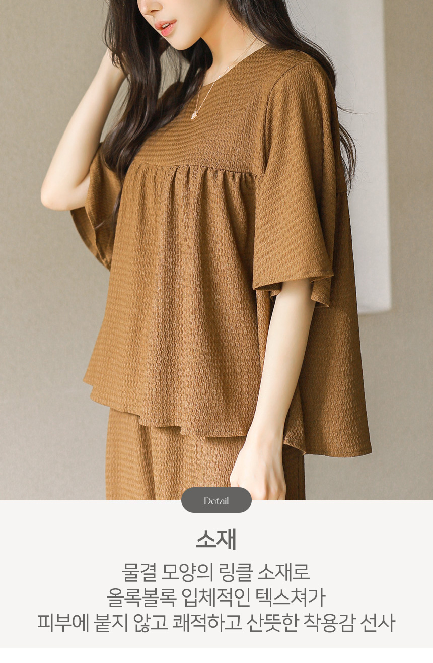 블라우스는 바스트 아래로 은은하게 퍼지는 셔링 디자인으로