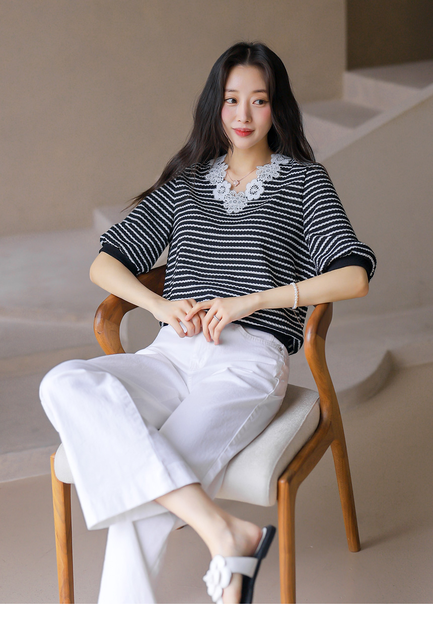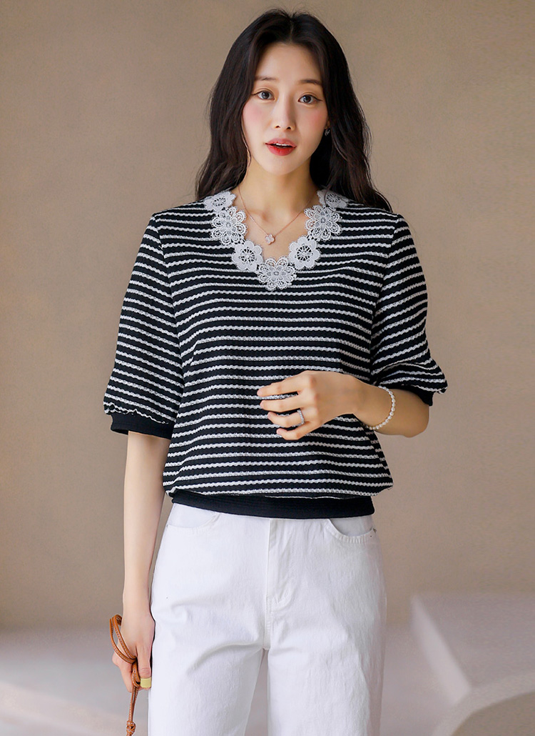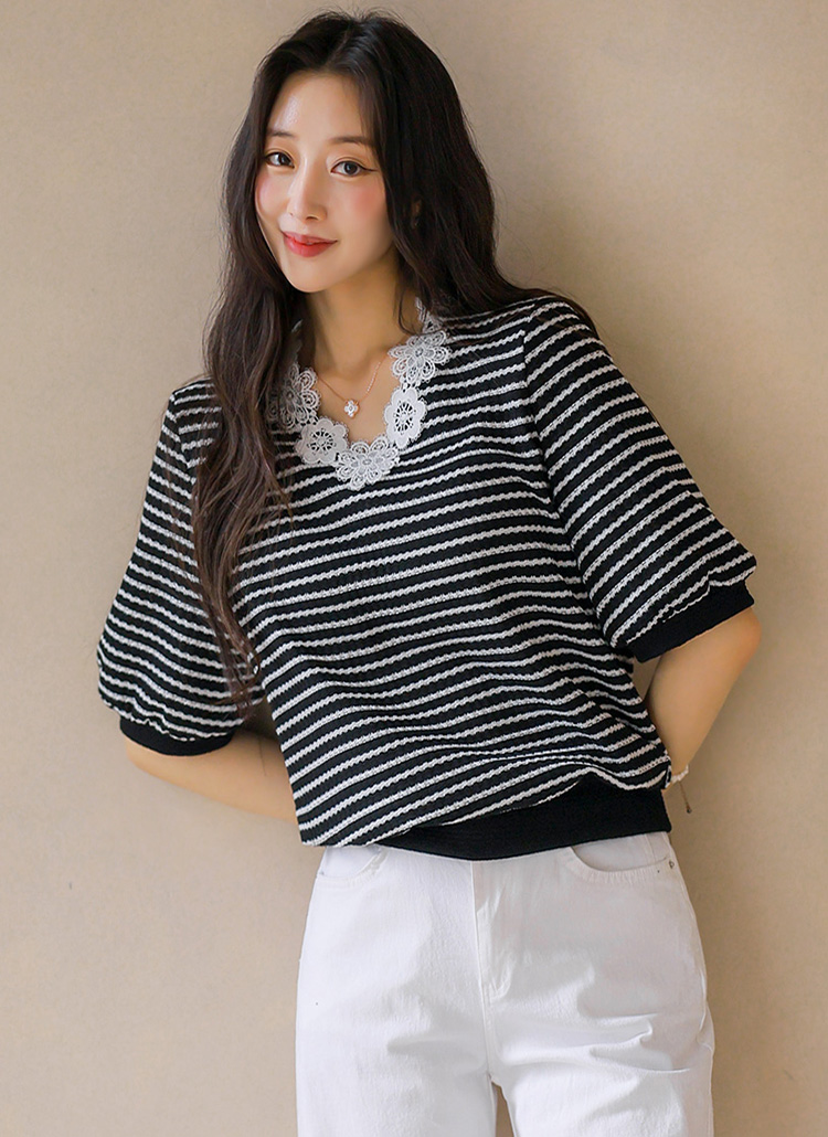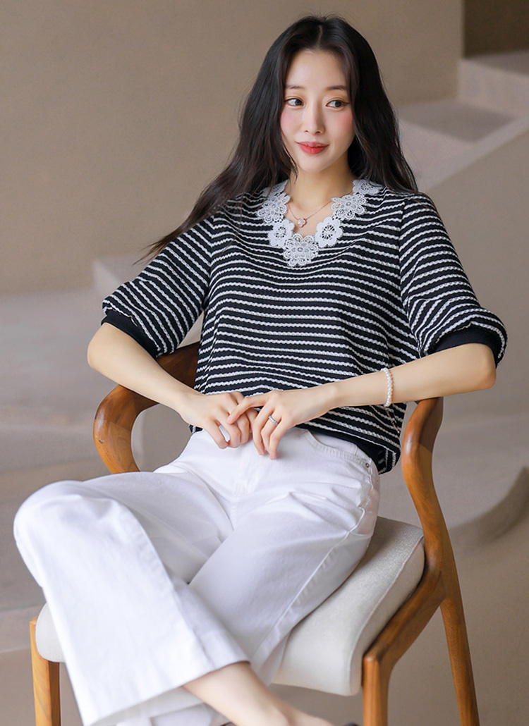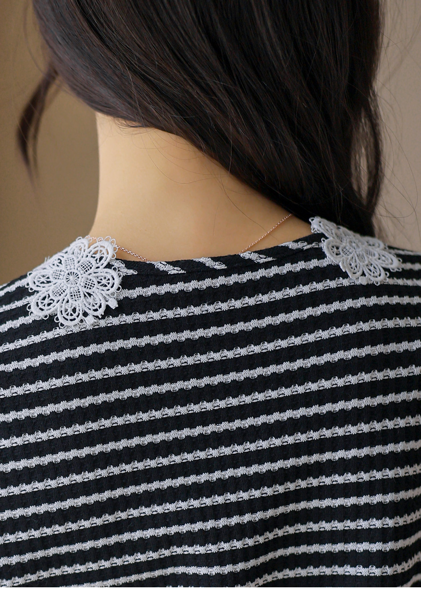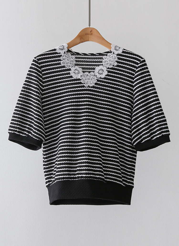 [LouisAngel] フラワーレース付き ジャガードボーダープルオーバー bl45362