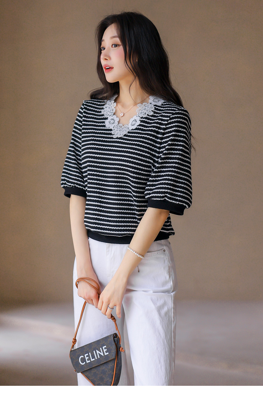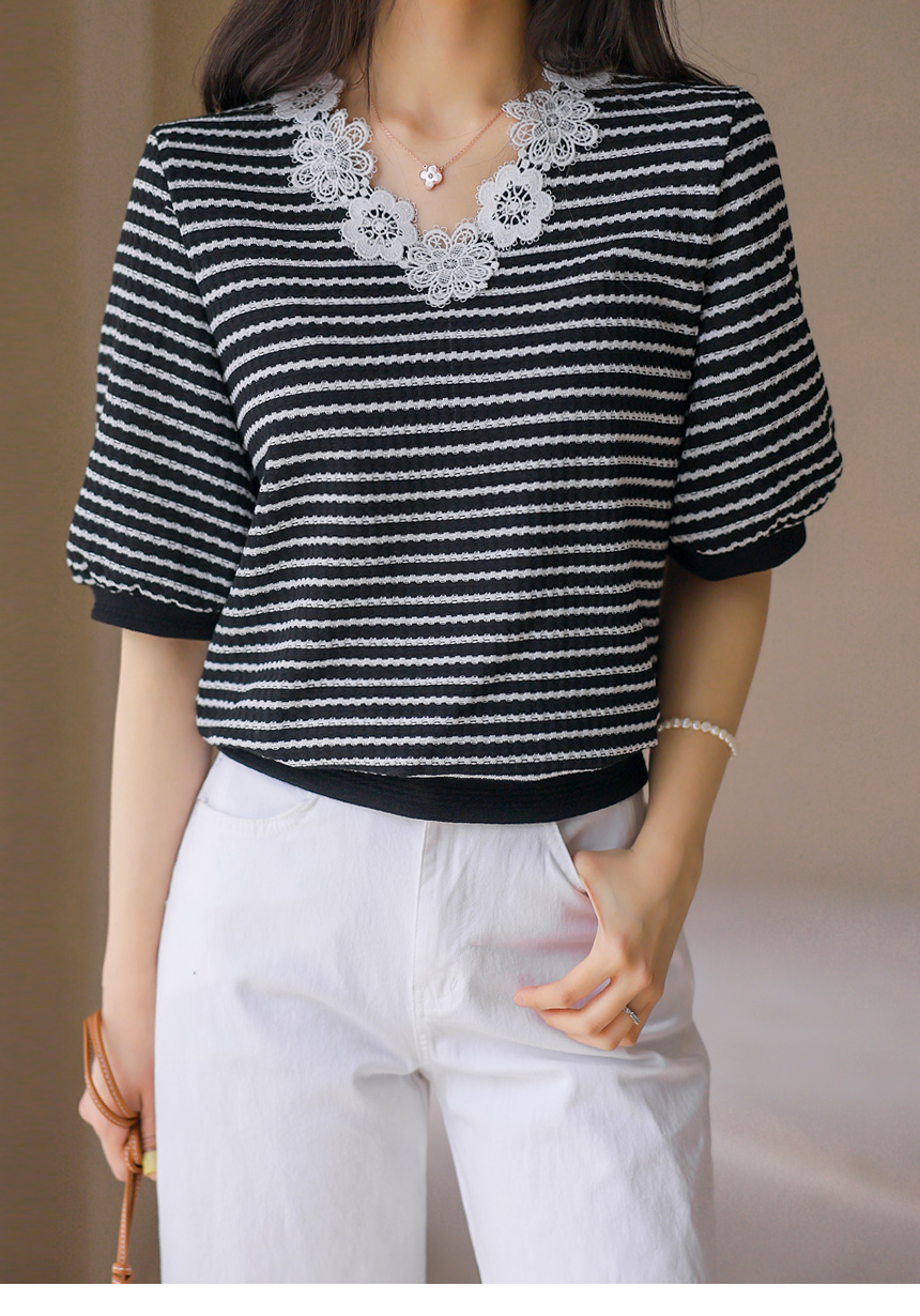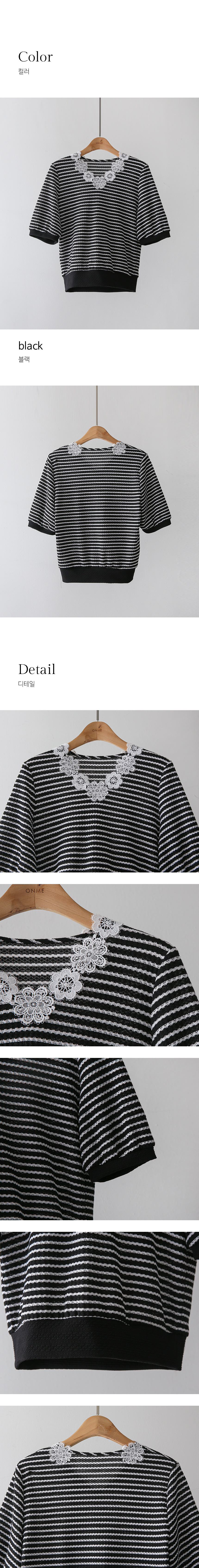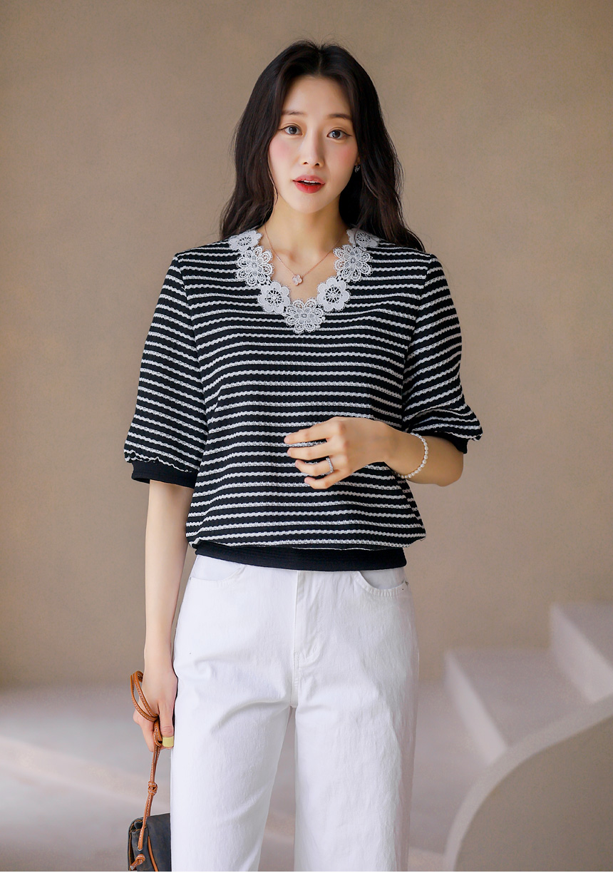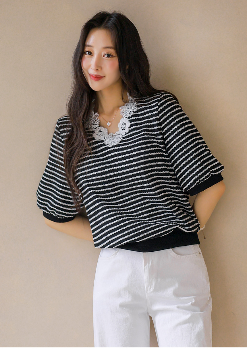 [LouisAngel] フラワーレース付き ジャガードボーダープルオーバー bl45362