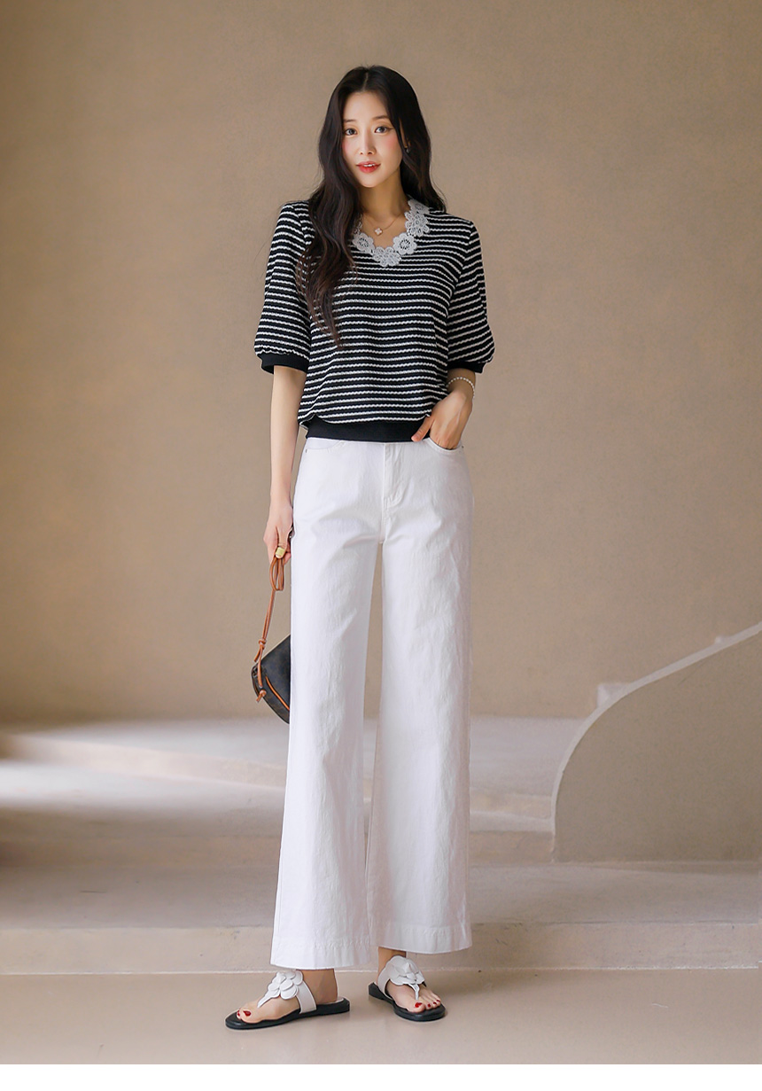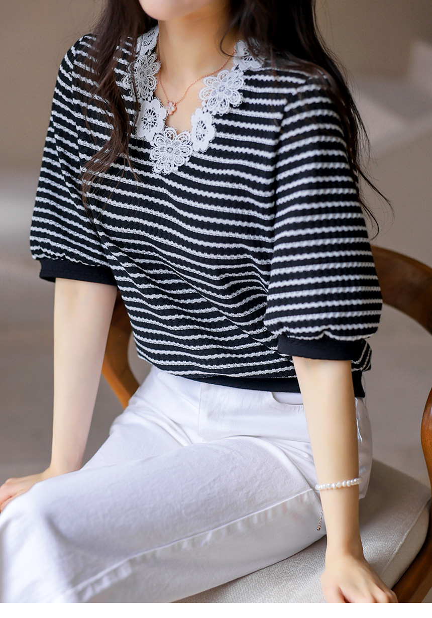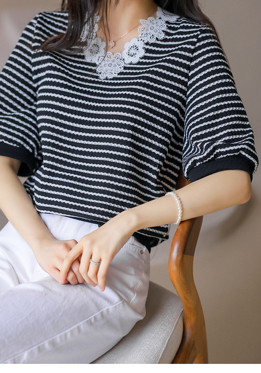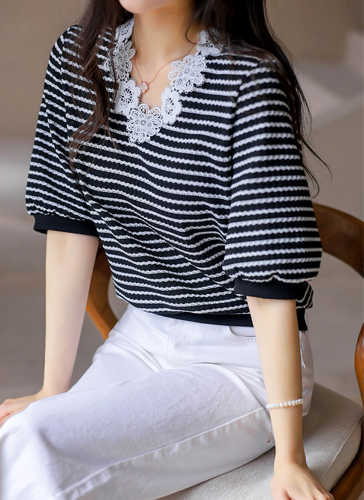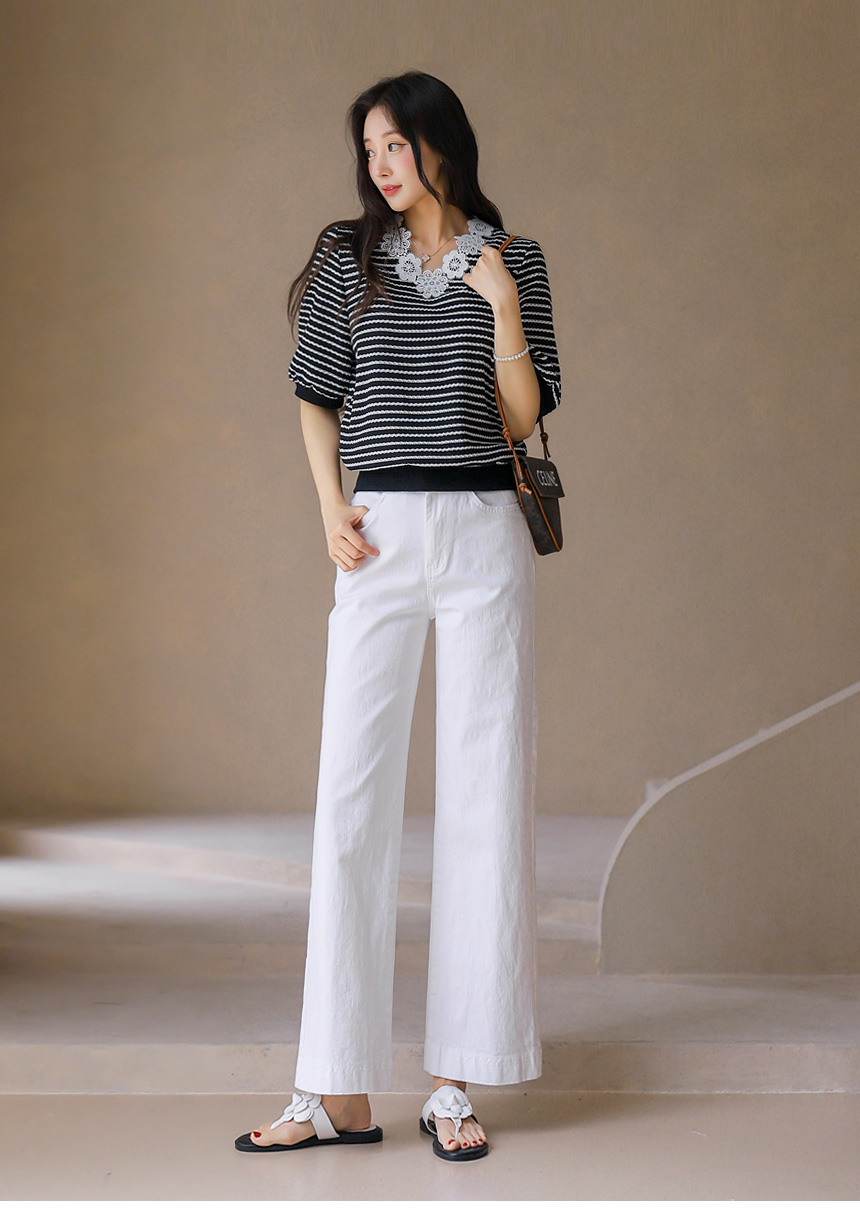 [LouisAngel] フラワーレース付き ジャガードボーダープルオーバー bl45362
