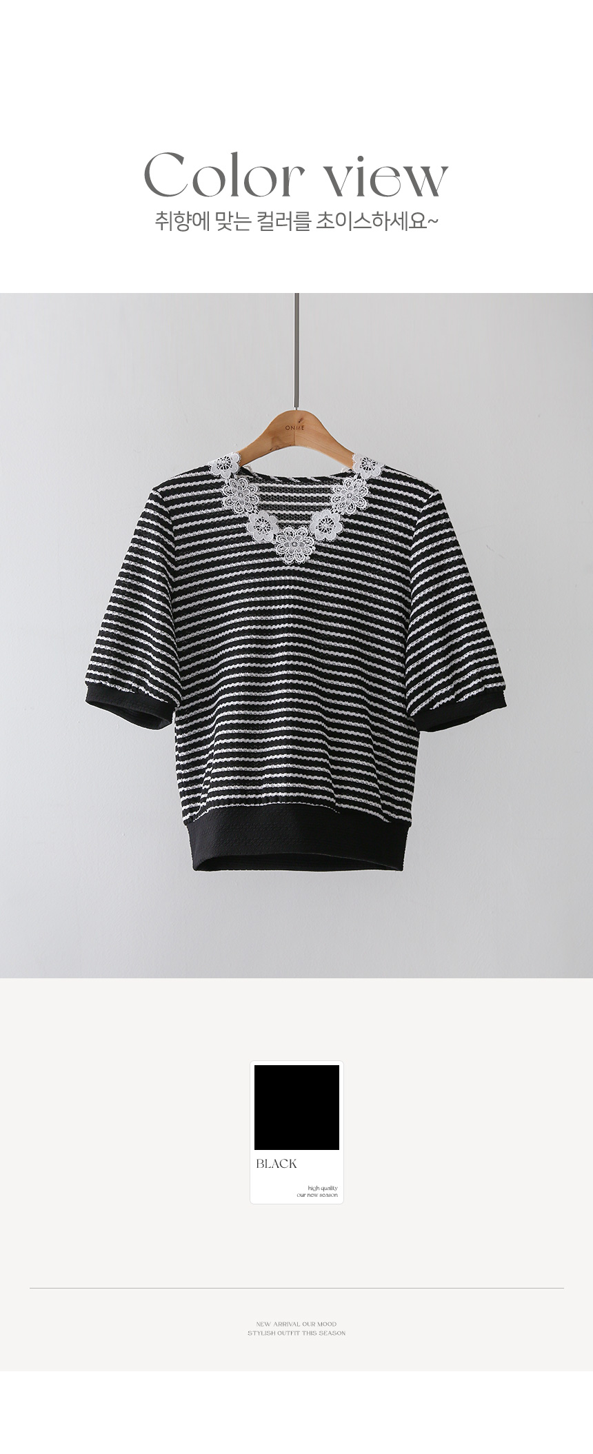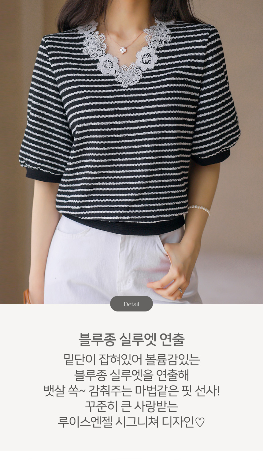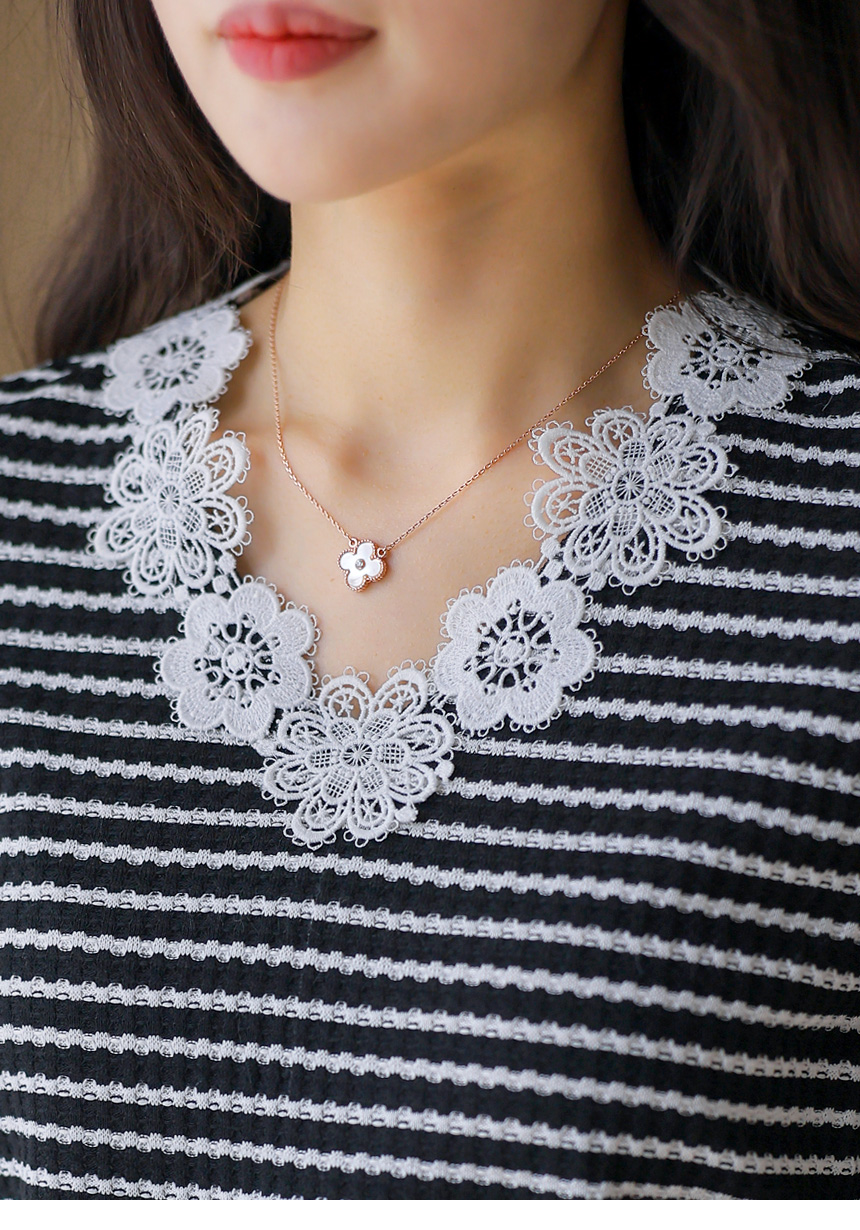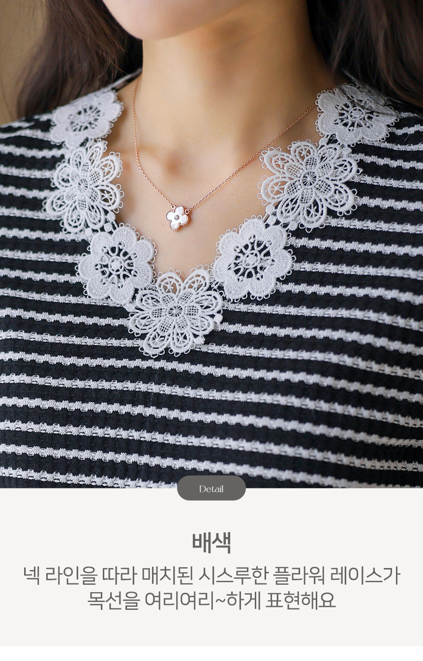 플라워 레이스로 섬세하게 장식된 넥 라인이 시선을 사로잡으며